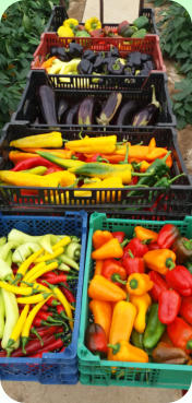 Im Winter produzieren wir Feldsalat, Spinat und Rosenkohl, im Sommer Tomaten u. Paprika. Gemüse das nicht von uns angebaut wird, beziehen wir von Kollegen frisch aus der Region. Verkauf im Blumenladen und in der Gärtnerei.